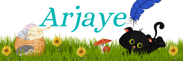 [Start of image description: Arjaye's signature with a blue feather floating in the air. Below is a meadow with yellow flowers with a a basket of pastel yarn and a hedgehog next to it. In the middle is two toadstools and a black cat running through the grass. End of image description.]
